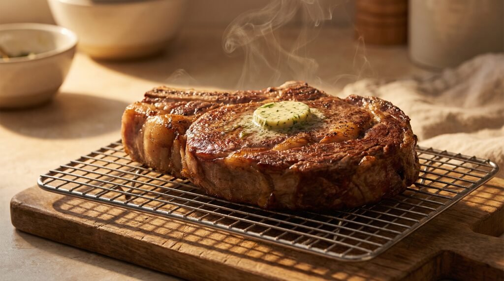 A thick ribeye pulled at 135°F will coast up to 145°F or higher while resting. That’s not medium-rare anymore — that’s solidly medium.
